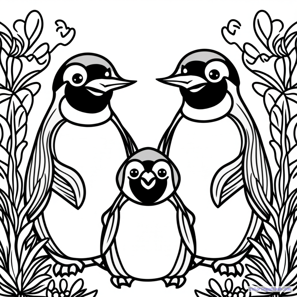A beautiful coloring page featuring penguin family with hearts.