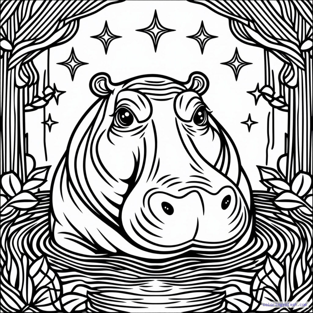 A beautiful coloring page featuring hippo in water with stars vintage style.
