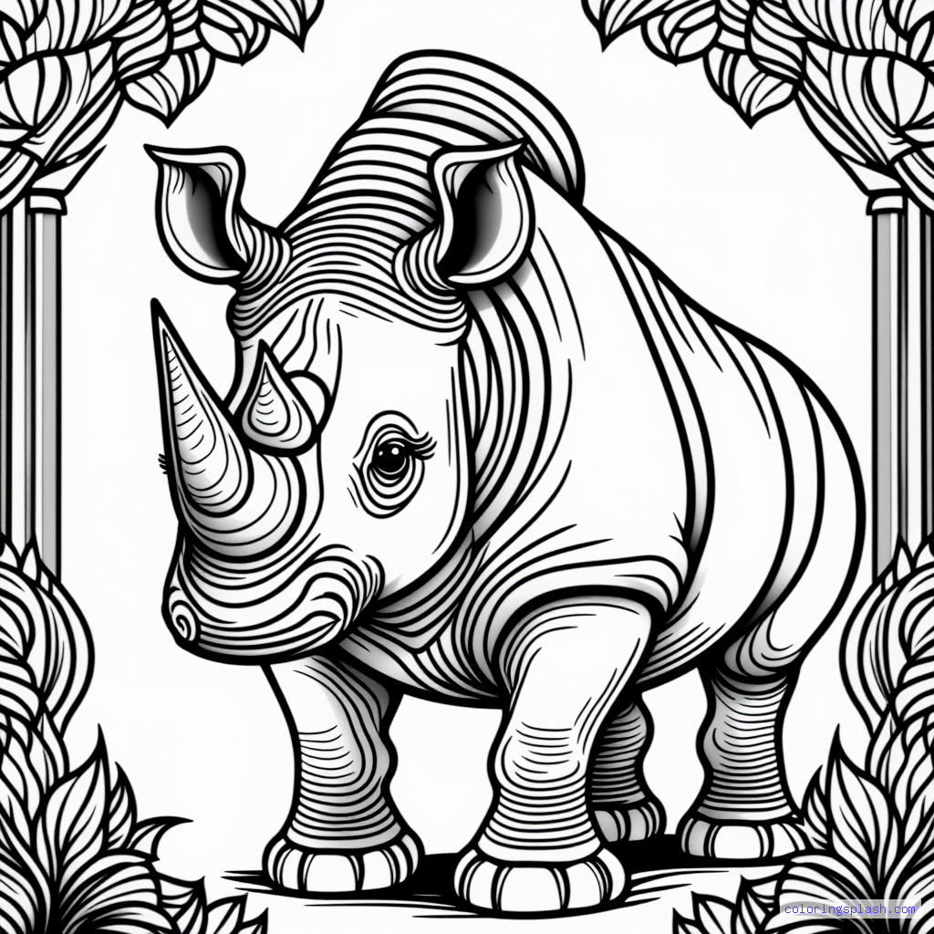A beautiful coloring page featuring rhino standing proud with rainbow detailed illustration.