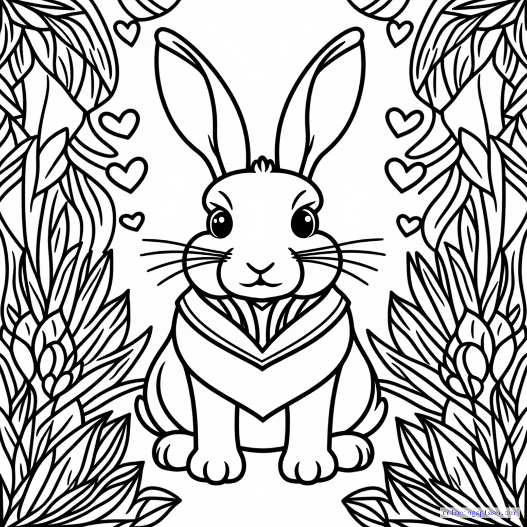 A beautiful coloring page featuring rabbit in garden with hearts simple line art.