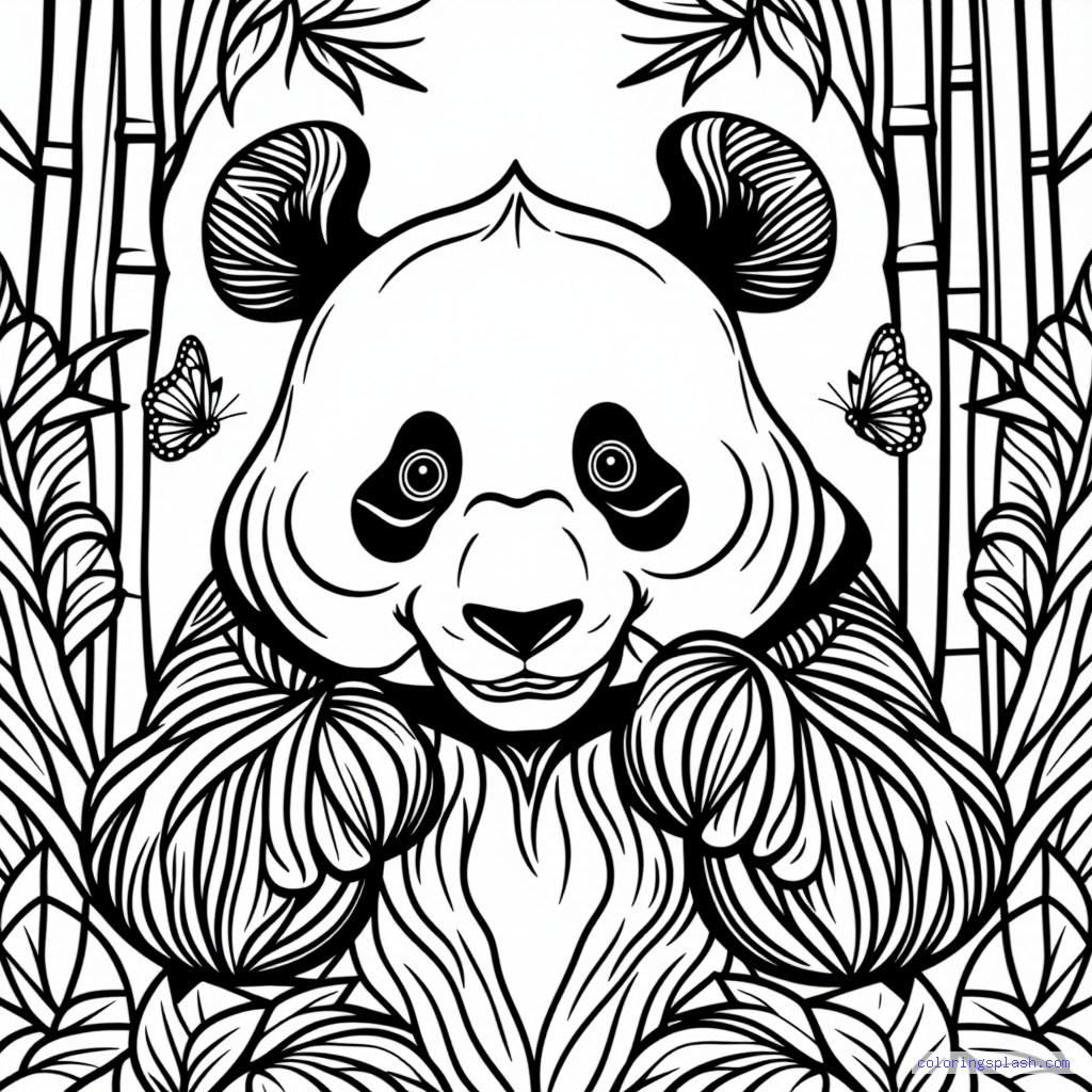 A beautiful coloring page featuring panda eating bamboo with butterflies.