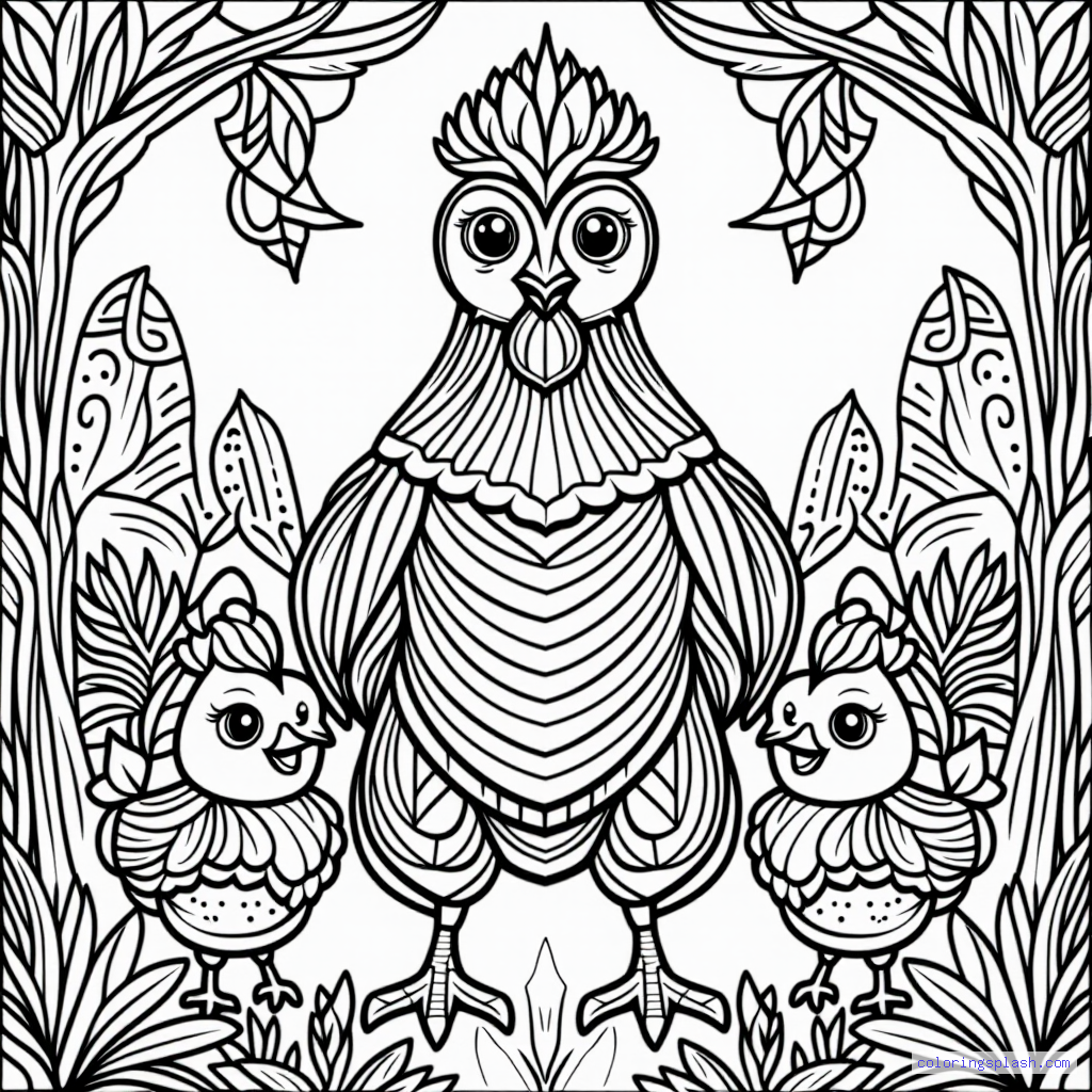 A beautiful coloring page featuring hen with chicks smiling detailed illustration.