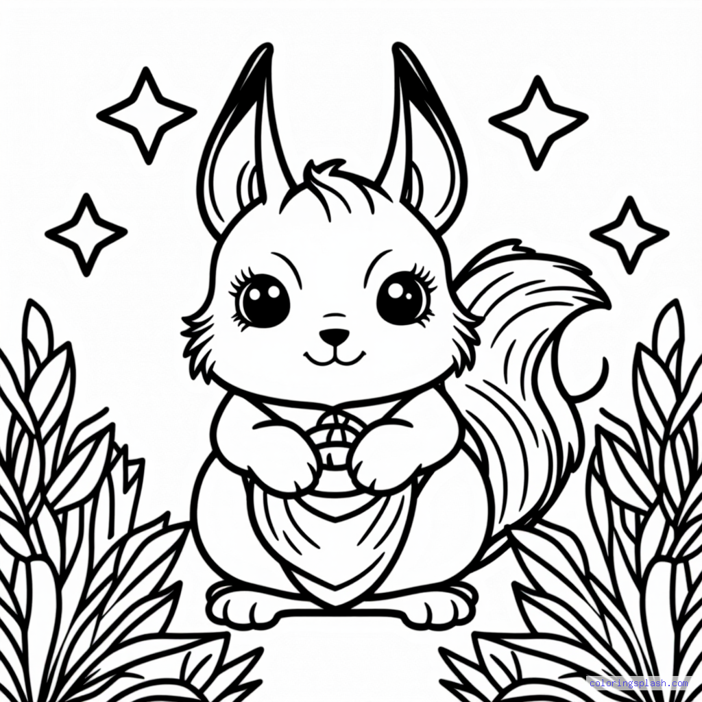 A beautiful coloring page featuring squirrel with acorn with stars cute kawaii style.