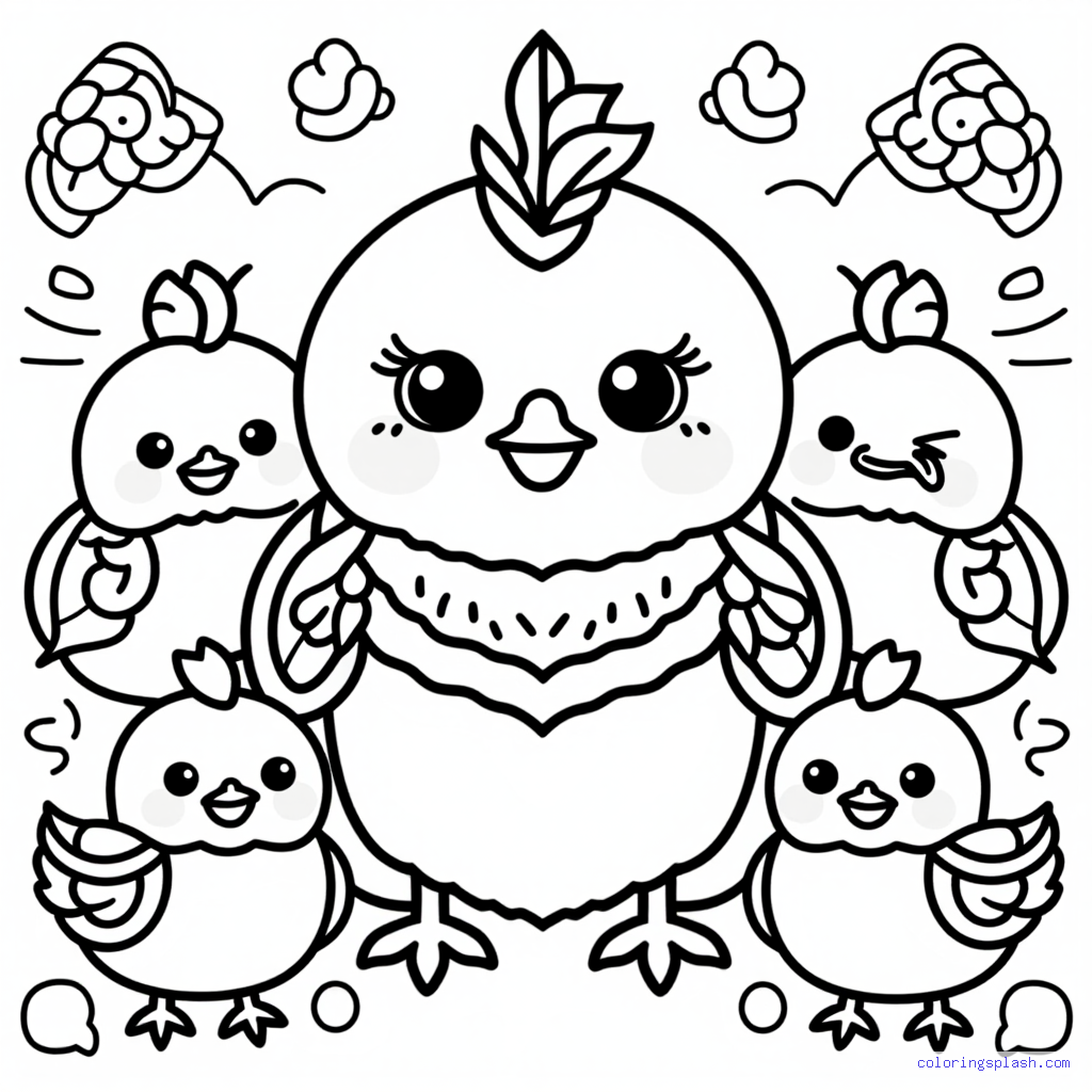 A beautiful coloring page featuring hen with chicks cute kawaii style.