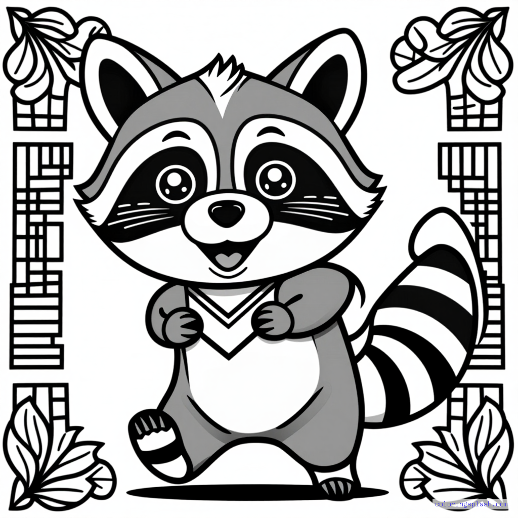 A beautiful coloring page featuring raccoon playing happily chibi style.