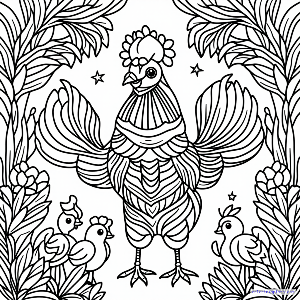 A beautiful coloring page featuring hen with chicks with stars storybook illustration.