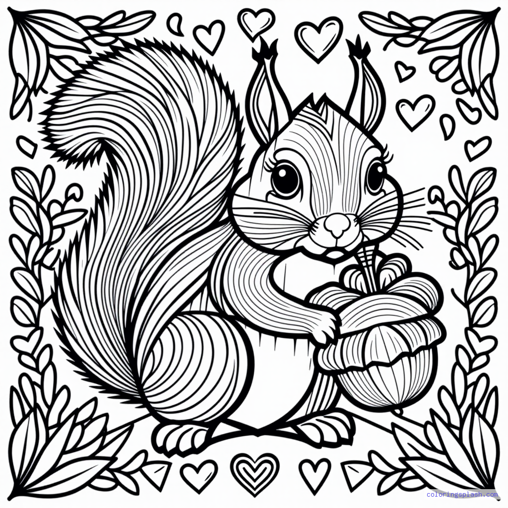 A beautiful coloring page featuring squirrel with acorn with hearts detailed illustration.