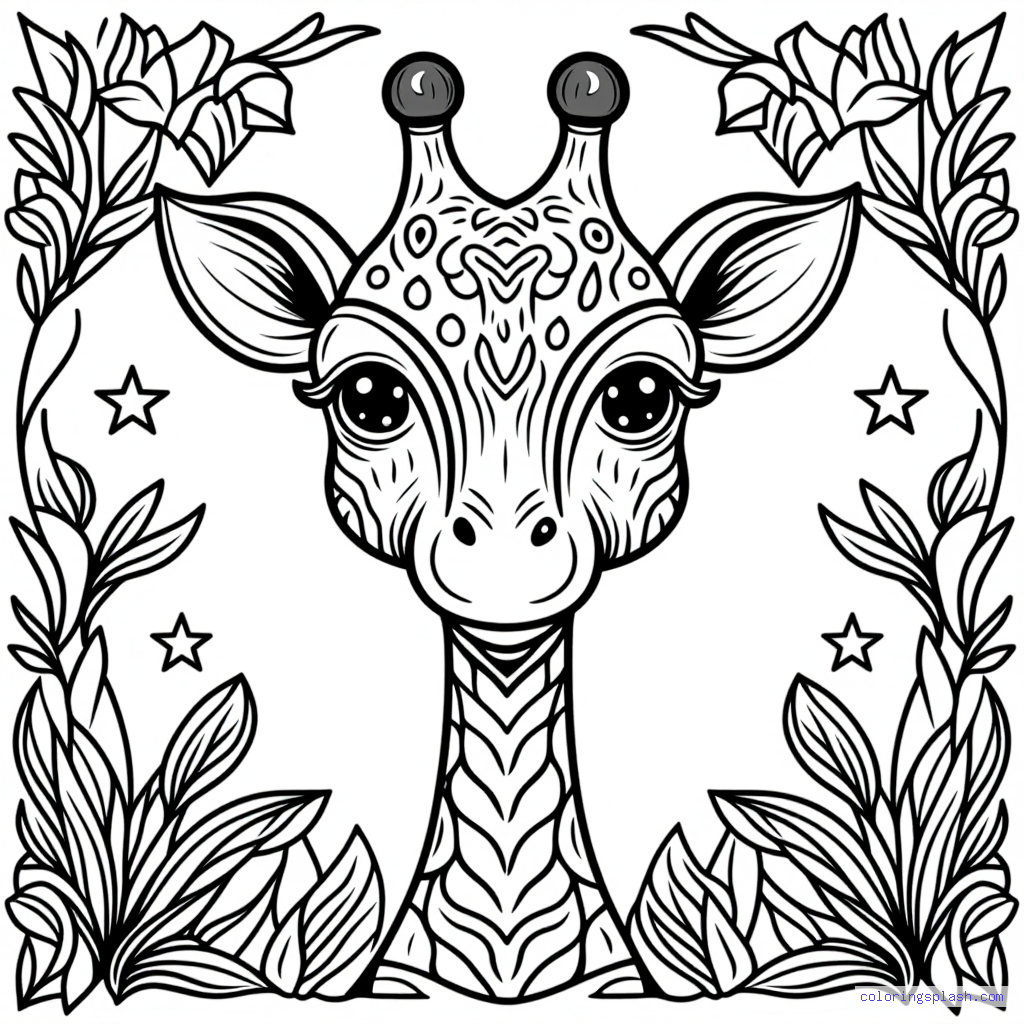 A beautiful coloring page featuring friendly giraffe with stars whimsical style.