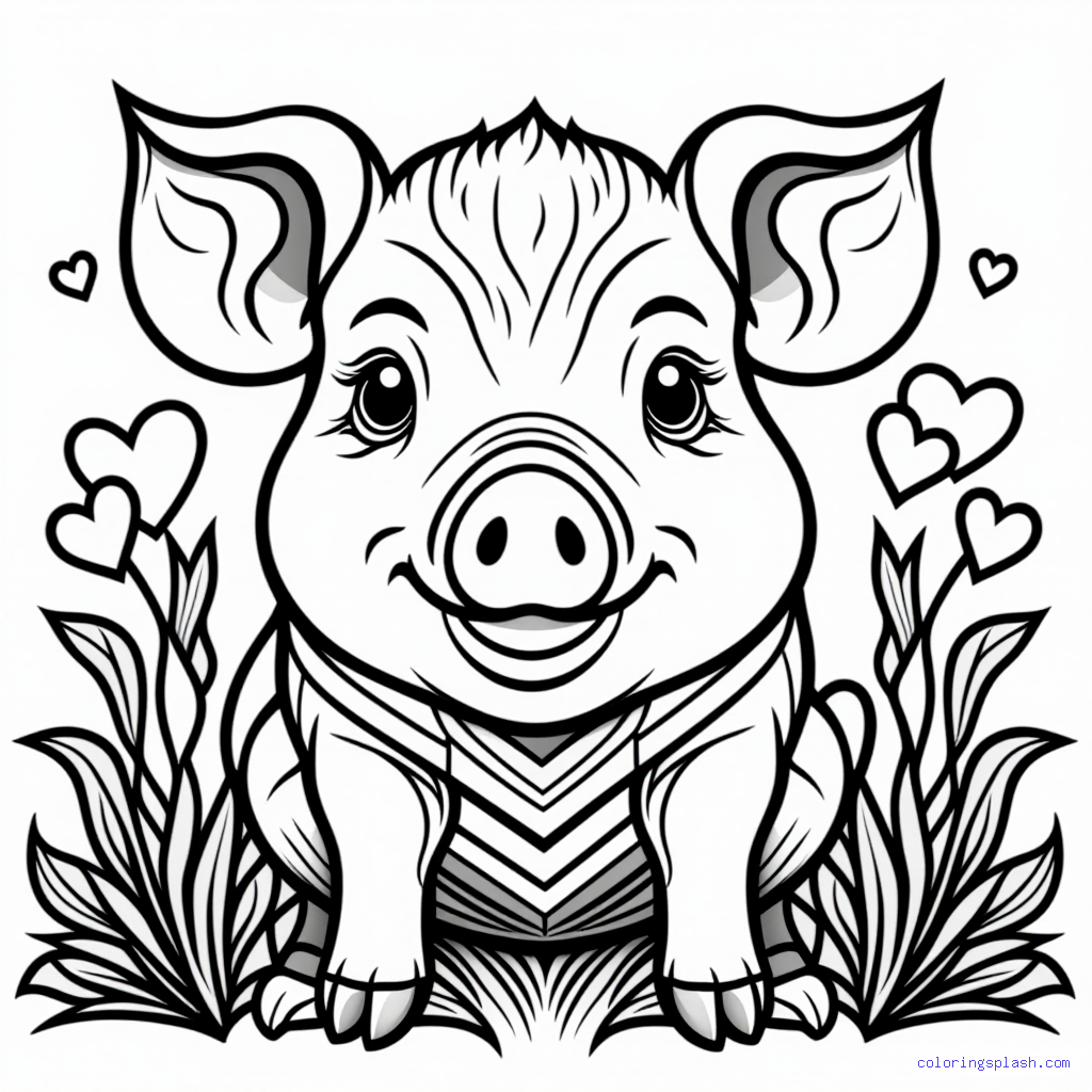 A beautiful coloring page featuring baby piglet with hearts whimsical style.