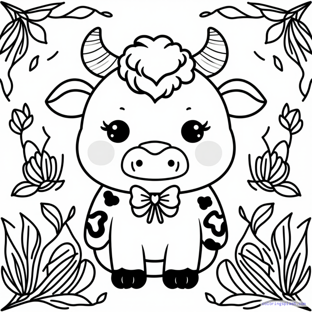 A beautiful coloring page featuring cute cow with spots with butterflies chibi style.