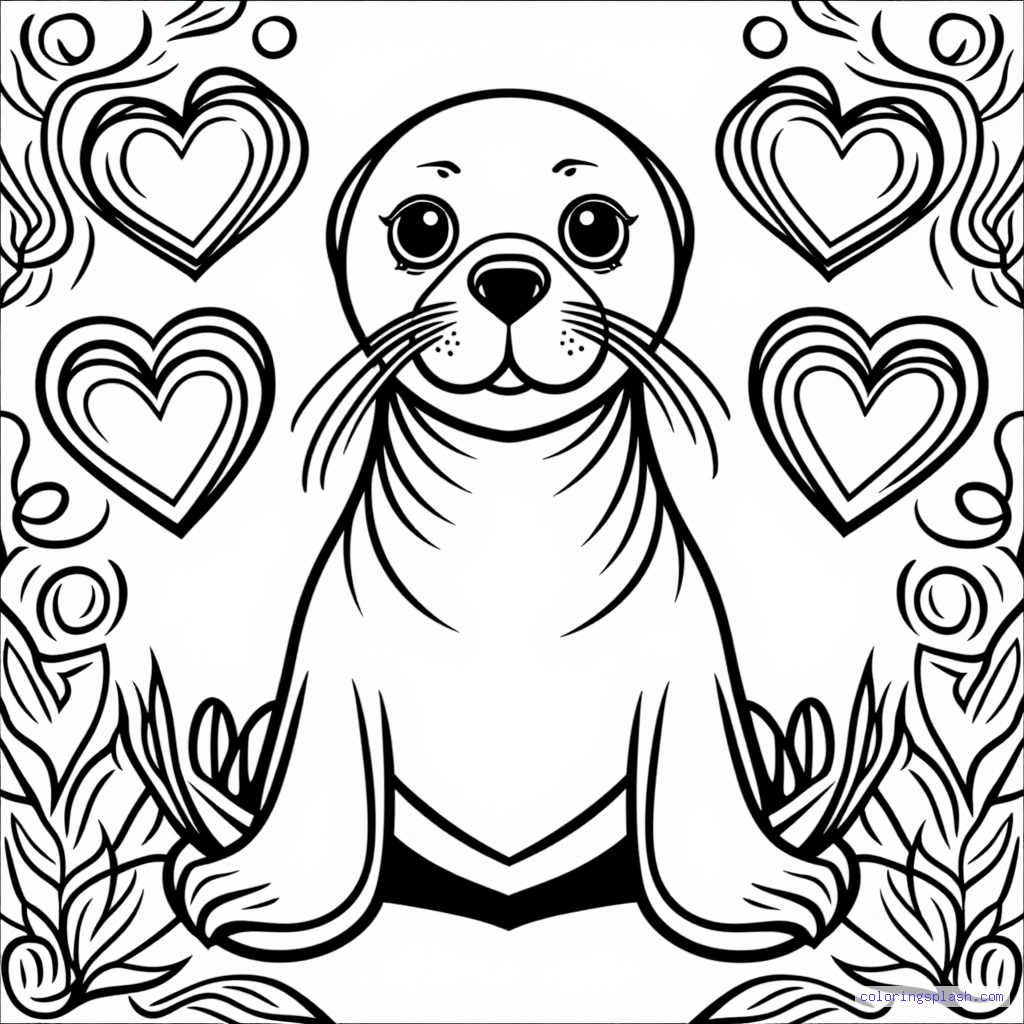 A beautiful coloring page featuring seal pup with hearts.