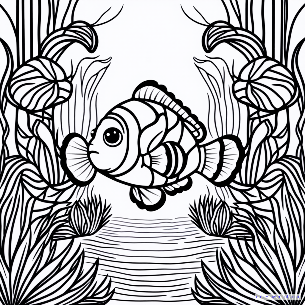 A beautiful coloring page featuring Nemo the clownfish in a garden.