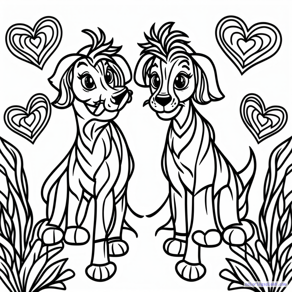 A beautiful coloring page featuring Pumbaa and Timon with hearts.