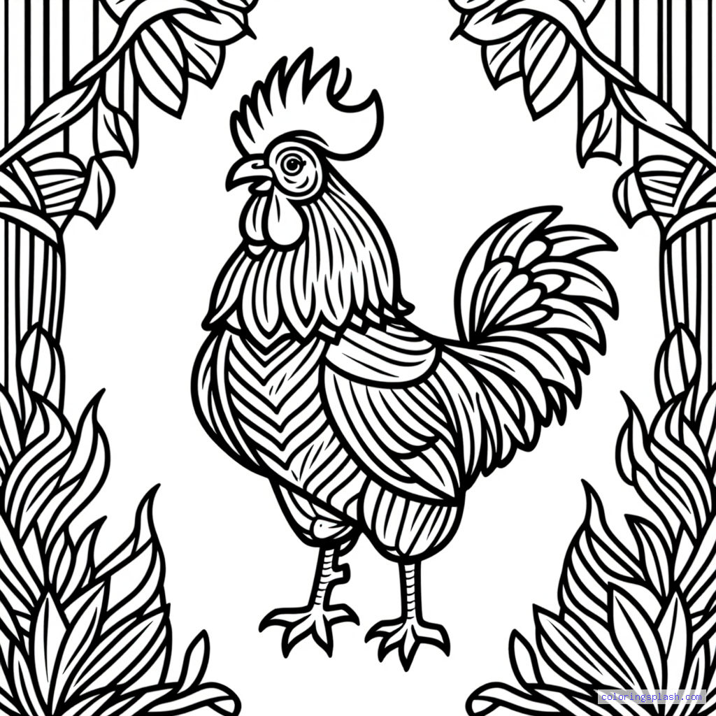 A beautiful coloring page featuring rooster crowing in nature simple line art.